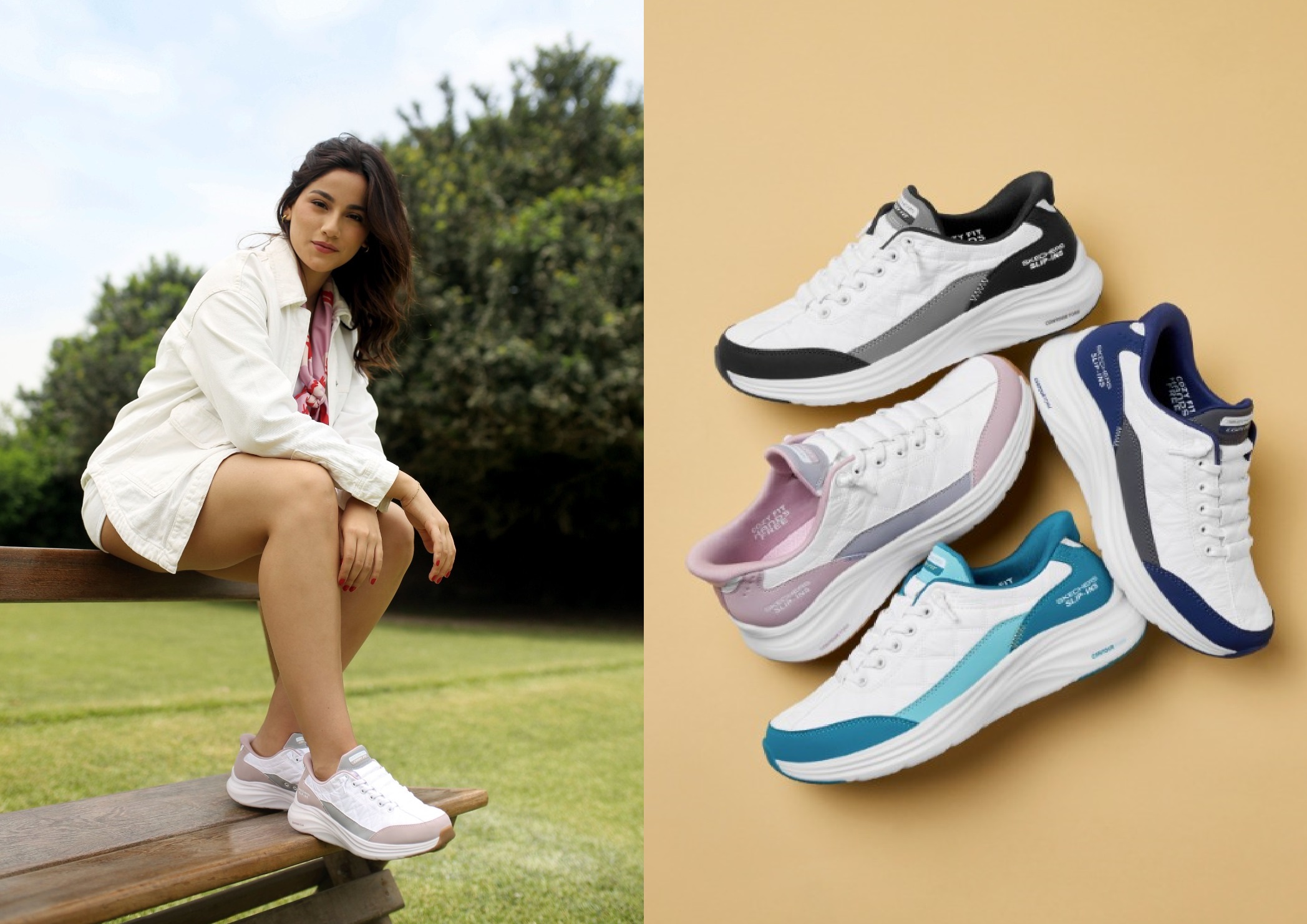 Skechers integra Hands Free Slip-ins® con Heel Pillow™, que permite calzar el zapato sin agacharse; Contour Foam™, una entresuela acolchada que ofrece suavidad y soporte; y la plantilla Air-Cooled Memory Foam®, que se adapta al pie y mantiene ventilación constante. Esta combinación refuerza el objetivo de la marca: elevar el confort diario sin sacrificar estilo.
